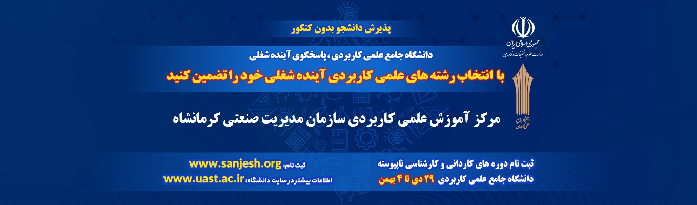مرکز علمی کاربردی سازمان مدیریت صنعتی کرمانشاه با مجوز از وزارت علوم، تحقیقات و فناوری در رشته های مدیریت، امور اداری، مددکاری، حسابداری و کامپیوتر در ترم های مهر و بهمن دانشجو می پذیرد. تلفن : 34237044